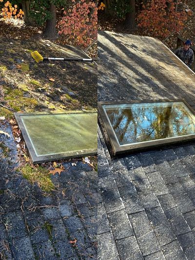 We use a low-pressure cleaning system designed specifically for asphalt shingles, metal roofs, and other delicate roofing surfaces. This method removes organic growth at the root while protecting the granules that provide UV protection and waterproofing. High-pressure washing is never used on roofs because it can strip shingle layers, void warranties, and cause costly damage.